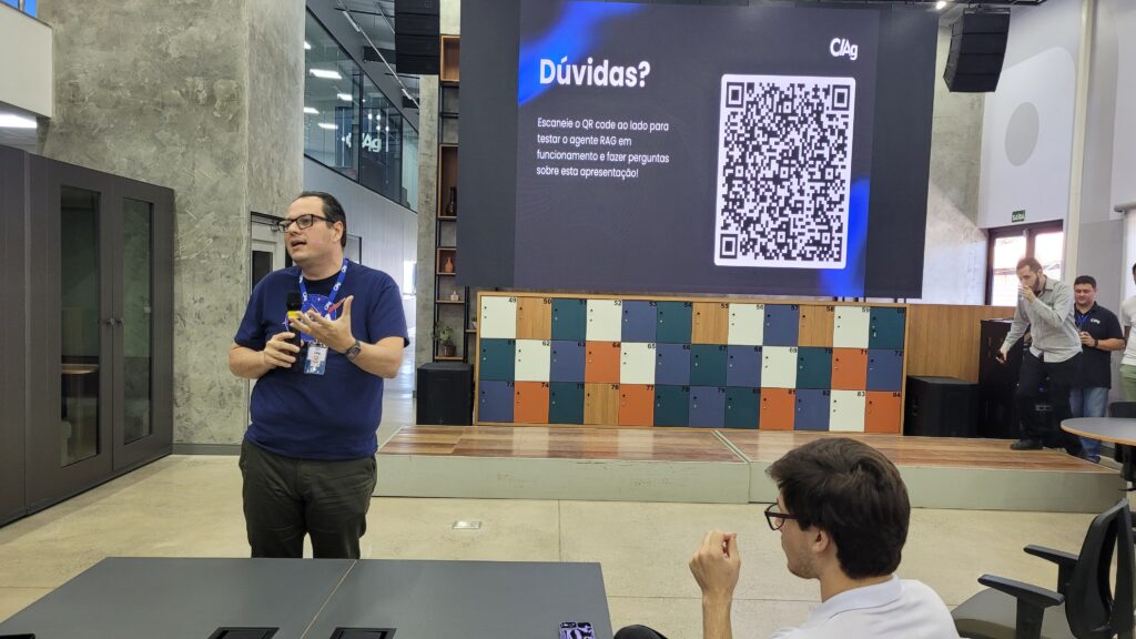 Abrindo com chave de ouro, Leonardo Savério, pesquisador tecnológico do Ciag, compartilhou insights sobre o papel dos agentes de Inteligência Artificial na automação de processos e no avanço tecnológico.