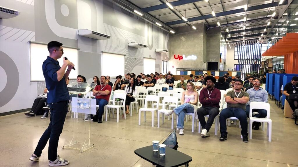 Desta vez, o encontro abordou o tema “Segurança no uso da inteligência artificial: ataques, riscos e defesas”, com o objetivo de ampliar a conscientização sobre os desafios e riscos emergentes relacionados à utilização da inteligência artificial. A apresentação foi conduzida por Gabriel Shimbo, analista de segurança da informação do Grupo Jacto.