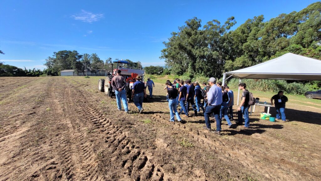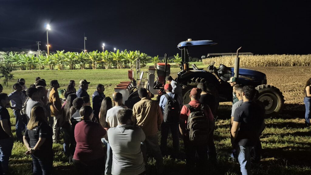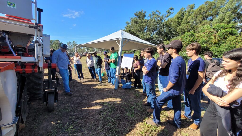 Na etapa prática, os participantes foram a campo, acompanhando de perto a apresentação e a avaliação de semeadoras destinadas ao plantio de grãos graúdos e miúdos. A atividade possibilitou a observação, em condições reais, dos impactos das regulagens no desempenho operacional.